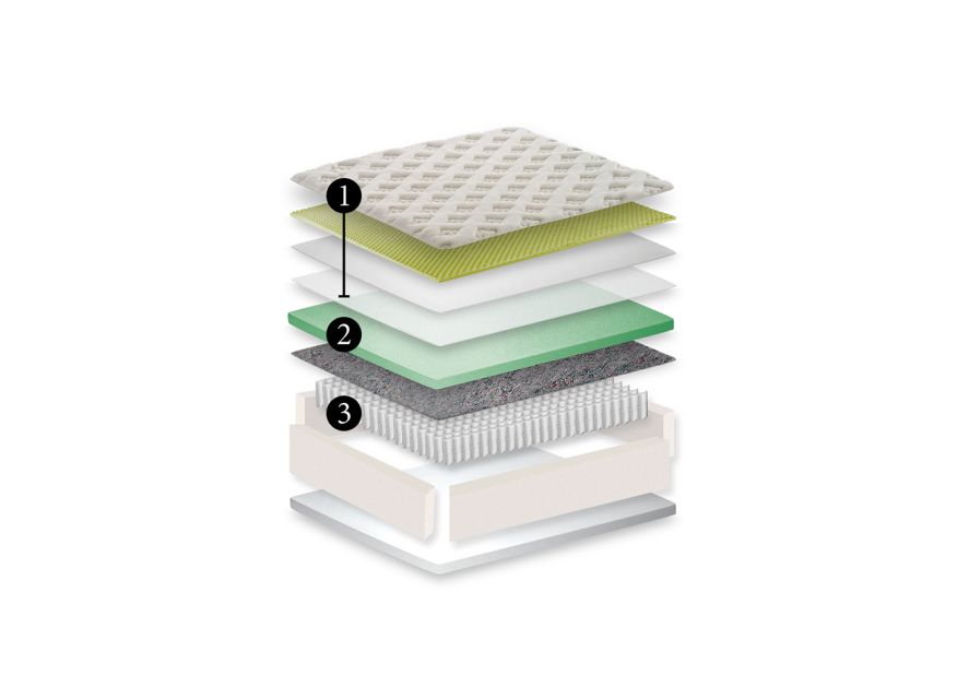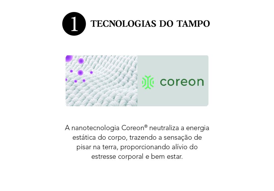 Disponível nas medidas solteiro, viúva e casal — nas versões padrão, queen e king size —, conta com tampo em malha nobre naturalmente hipoalergênica, composta por Viscose de Bambu e fios de linho, que garantem toque macio, frescor e excelente respirabilidade. A exclusiva nanotecnologia Coreon® dissipa a energia estática do corpo, promovendo um sono mais tranquilo e relaxante.